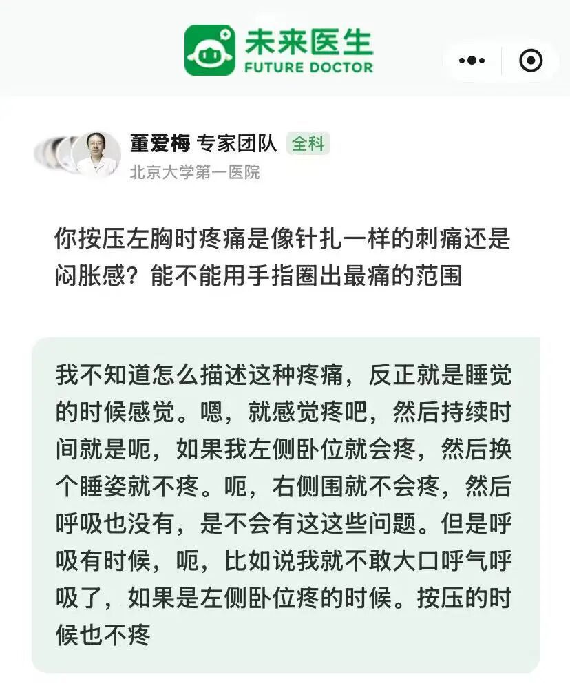 在未来医生多学科专家团队讨论完成后,胸外科专家智能体、疼痛科专家智能体、心血管内科专家智能体、全科专家智能体分别对我的情况给出了判断和指导性意见,最后给出的综合意见提取就是:根据您描述的左侧卧位时左胸特定区域疼痛、变换姿势可缓解的特点,多位专家一致认为这与胸壁结构受压或牵拉高度相关,而非心肺等内脏问题。疼痛在按压无痛、日常活动不诱发的情况下,更倾向于肋间神经受卡压或胸椎小关节功能紊乱等力学因素所致,急性心血管风险较低。当前建议立即安排胸椎和胸部影像学检查以明确诊断;待结果完善后,由胸外科专家主导评估,排查胸膜或神经源性疼痛;长期需关注睡眠姿势调整,避免长时间维持左侧卧位。