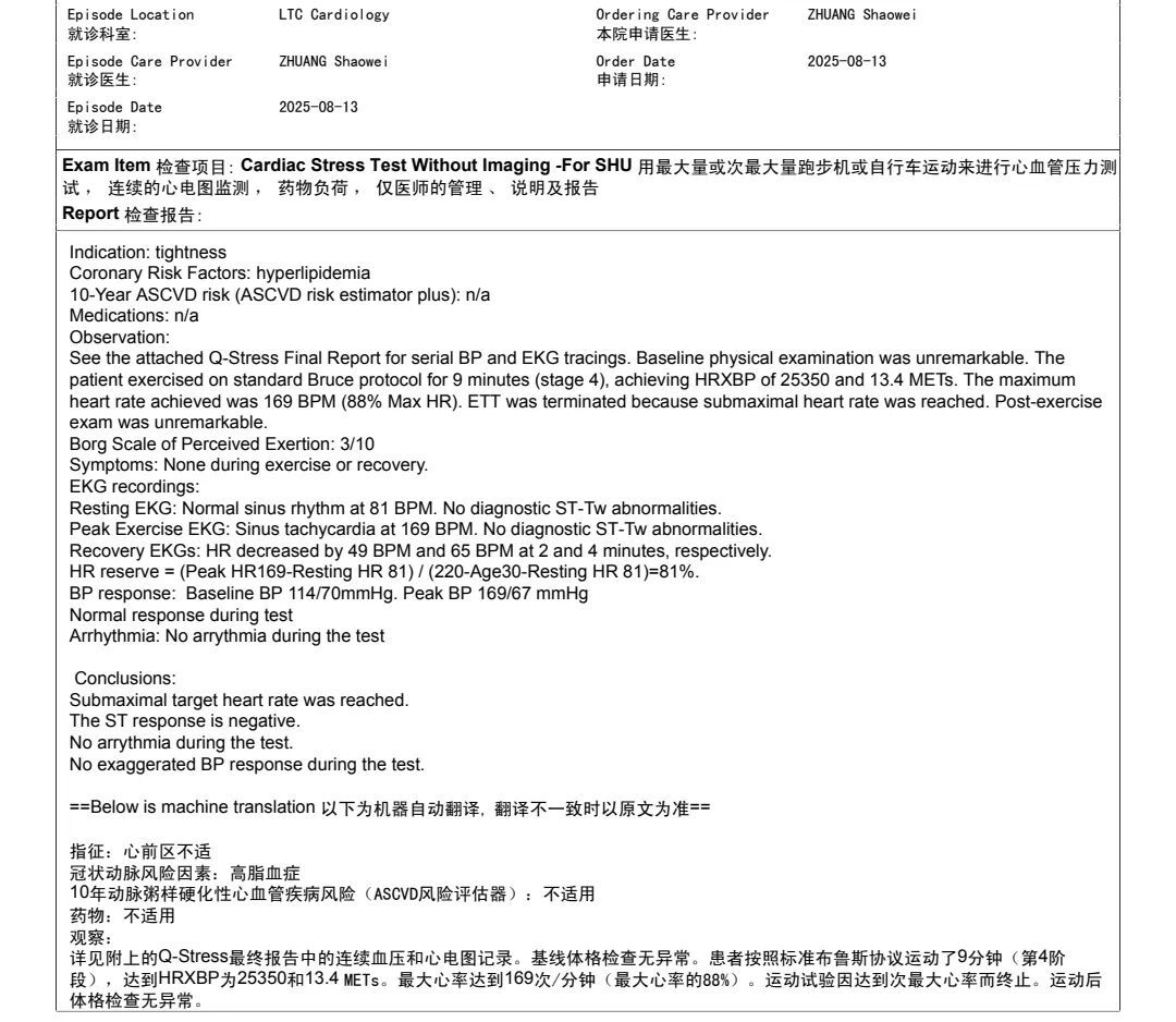 医生让我做了胸部CT,用最大量跑步机和自行车运动来进行心血管压力测试,做连续的心电图监测,但体格检查无异常。