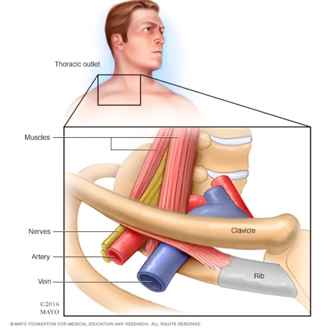 “胸廓出口”指的是颈部与肩部之间的狭窄通道,一些重要的神经和血管会由此经过丨mayoclinic.org